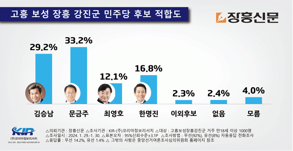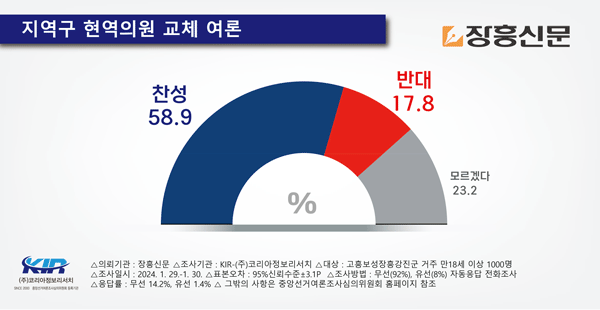 °íÈﺸ¼ºÀåÈï°Áø±º ±¹È¸ÀÇ¿ø¼±°Å ¿©·ÐÁ¶»ç´Â ÀåÈï½Å¹®ÀÌ KIR-(ÁÖ)ÄÚ¸®¾ÆÁ¤º¸¸®¼Ä¡¿¡ ÀÇ·ÚÇÏ¿© 1¿ù 29ÀϺÎÅÍ 30ÀϱîÁö ÀÌÆ²°£ ¸¸ 18¼¼ ÀÌ»ó À¯±ÇÀÚ 1000¸íÀ» ´ë»óÀ¸·Î ÀÚµ¿ÀÀ´äÀüÈÁ¶»ç·Î ÁøÇàÇß°í, ÇÇÁ¶»çÀÚ¼±Á¤¹æ¹ýÀº ¹«¼±ÀüÈ °¡»ó¹øÈ£RDD 92%, À¯¼±ÀüÈRDD 8%À̸ç, ÀÀ´ä·üÀº ¹«¼±ÀüÈ 14.2%, À¯¼±ÀüÈ 1.4%À̸ç, Ç¥º»¿ÀÂ÷´Â 95% ½Å·Ú¼öÁØ¿¡ ¡¾3.1%p.ÀÌ´Ù. Á¶»ç³»¿ëÀº Èĺ¸ÀÚ ÀûÇÕµµ µîÀ̸ç, °¡Áß°ªÀº 2023³â 12¿ù ¸» ÇàÁ¤¾ÈÀüºÎ Áֹεî·Ï Àα¸ ±âÁØ ¼ºº°, ¿¬·Éº°, Áö¿ªº° ¼¿°¡ÁßÀ» Àû¿ëÇß´Ù. ±×¹ÛÀÇ ÀÚ¼¼ÇÑ »çÇ×Àº Áß¾Ó¼±°Å¿©·ÐÁ¶»ç½ÉÀÇÀ§¿øÈ¸ ȨÆäÀÌÁö¸¦ ÂüÁ¶ÇÏ¸é µÈ´Ù.