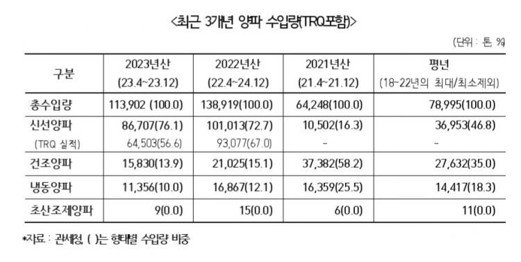 À±¼®¿Á¤ºÎ(2022³â 5¿ù~)°¡ Ãâ¹üÇÑ ÀÌÈÄ·Î ¾çÆÄ ¼öÀÔ·®ÀÌ ´ëÆø Áõ°¡Çß´Ù. ÃѼöÀÔ·®Àº 2021³â»ê 64,248ÅæÀ̾úÀ¸³ª 2022³â 138,919Åæ, 2023³â»ê 113,902ÅæÀ¸·Î ´Ã¾î³µ°í, ƯÈ÷ ½Å¼±¾çÆÄÀÇ ¼öÀÔ·®ÀÌ Å©°Ô ´Ã¾î³ª ±¹³» »ý»ê³ó°¡¿¡ Á÷Á¢ÀûÀÎ ÇÇÇØ¸¦ ÁÖ°í ÀÖ´Ù. ƯÈ÷ TRQ ¹°·®(ÀúÀ²ÇÒ´ç°ü¼¼, ½Å¼±¾çÆÄ)ÀÌ 2022³â¿¡´Â Àüü ¼öÀÔ·®ÀÇ 67%, 2023³â¿¡´Â 56.6%·Î °ª½Ñ ½Å¼±¾çÆÄ ¼öÀÔÀ¸·Î ¸Å³â ±¹³» »ý»ê³ó°¡´Â ¾î·Á¿ò¿¡ Á÷¸éÇϰí ÀÖ´Ù.