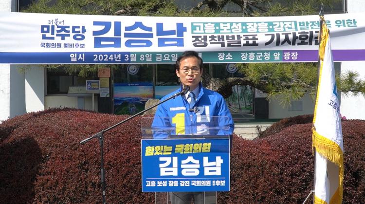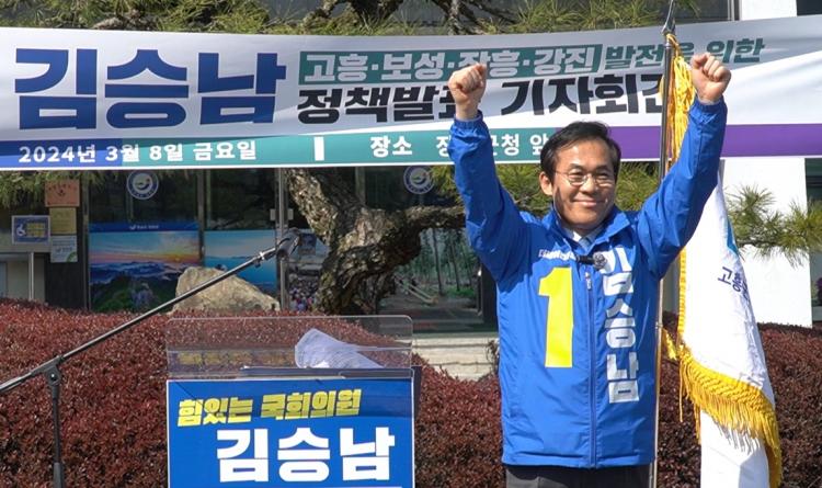 ´õºÒ¾î¹ÎÁÖ´ç ±è½Â³² ¿¹ºñÈĺ¸(Àü³² °íÈº¸¼º¡¤ÀåÈ°Áø)°¡ 8ÀÏ ÀåÈﱺû ¾Õ ±¤Àå¿¡¼ ±âÀÚȸ°ßÀ» ¿°í, ¡°°íÈº¸¼º¡¤ÀåÈ°Áø KTX ½Ã´ë¸¦ ¾Õ´ç±â°í, °Áø¸¸~µæ·®¸¸~¿©ÀÚ¸¸ °æ°üµµ·Î¸¦ Á¶¼ºÇÏ´Â ÇÑÆí, ³²ÇØ¾È±Ç °³¹ß Àü´ã±â°üÀ» ¸¸µé¾î °íÈº¸¼º¡¤ÀåÈ°ÁøÀÇ ´õ Å« º¯È¿Í ¹ßÀüÀ» À̲ø°Ú´Ù¡±¸ç <°íÈº¸¼º¡¤ÀåÈ°Áø ¹ßÀüÀ» À§ÇÑ 3´ë ºñÀü°ú ¾à¼Ó>À» ¹ßÇ¥Çß´Ù.