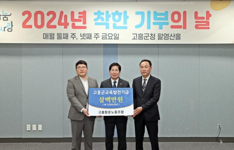 À§¿øÈ¸¿¡ µû¸£¸é, 12ÀÏ Áö¿ª ±³À° ¹ßÀü°ú ÀÎÀç ¾ç¼ºÀ» À§ÇØ °íÈï dz¾ç³óÇù(Á¶ÇÕÀå ¼Û¿µÃ¶)ÀÌ ±³À°¹ßÀü±â±Ý 1õ¸¸ ¿øÀ» ±âŹÇß°í, ¢ß¿ì¸®±â¾÷(´ëÇ¥ ¼¸í¿ø)°ú °íÈïÇ׿î³ëµ¿Á¶ÇÕ(À§¿øÀå ±èÈñ¿õ)¿¡¼µµ °¢°¢ 300¸¸ ¿øÀÇ ±â±ÝÀ» Àü´ÞÇß´Ù.