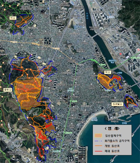 ÀÔ»êÅëÁ¦±¸¿ªÀº Àüü »ê¸² 244haÀÇ 31.7%ÀÎ 77.45ha, µî»ê·Î ÃÑ 35°³ ³ë¼±(28.7§°) Áß °³¹æ 25°³ ³ë¼± 22.8§°, Á¦ÇÑ 10°³ ³ë¼± 5.9§°ÀÌ´Ù. ¶ÇÇÑ, ¼ö¿µ±¸ »ê¸² ÀüÁö¿ª(244ha)À» ȱ⹰Áú µî ¼ÒÁö±ÝÁö±¸¿ªÀ¸·Î ÁöÁ¤ÇÏ¿´´Ù.