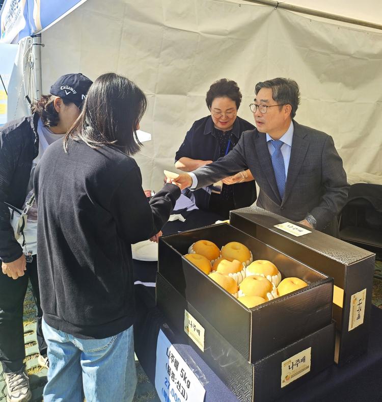 | °»ó±¸ ³ªÁÖ ºÎ½ÃÀå(¿À¸¥ÂÊ)ÀÌ ´ëȸÀåÀ» ãÀº °ü¶÷°´µé°ú ¼±¼öµé¿¡°Ô Á÷Á¢ ³ªÁֹ踦 È«º¸Çϰí ÀÖ´Ù. (»çÁø Á¦°ø-³ªÁÖ½Ã) |