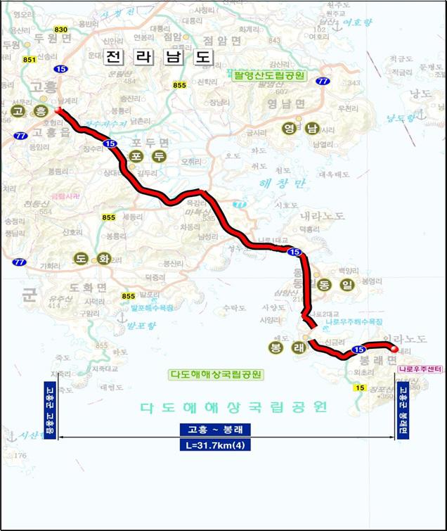 ¡®±¹µµ 15È£¼± °íÈï~ºÀ·¡ È®Àå»ç¾÷¡¯Àº °íÈﱺ °íÈïÀ¾ È£Çü¸®ºÎÅÍ ºÀ·¡¸é ¿¹³»¸®(³ª·Î¿ìÁÖ¼¾ÅÍ)±îÁö 31.7km ±¸°£À» ±âÁ¸ 2Â÷·Î¿¡¼ 4Â÷·Î·Î È®ÀåÇÏ´Â »ç¾÷À̸ç, ÃÑ»ç¾÷ºñ´Â 6,521¾ï ¿ø(¿¹ºñŸ´ç¼ºÁ¶»ç ±âÁØ) ±Ô¸ð´Ù.