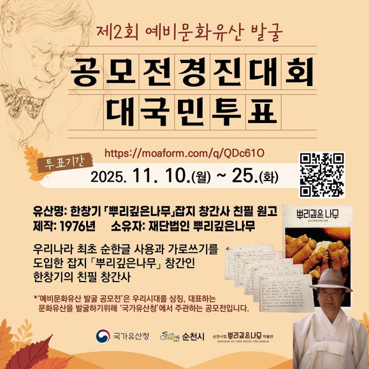 ½Ã °ü°èÀÚ´Â ¡°±¹¹ÎÀÌ Á÷Á¢ ¼±ÅÃÇÏ´Â À̹ø °ø¸ðÀüÀÌ ÇÑâ±â ¼±»ýÀÇ ¹®ÈÈ¥À» ³Î¸® ¾Ë¸®´Â ±âȸ°¡ µÇ±â¸¦ ¹Ù¶õ´Ù¡±¸ç, ¡°¼øÃµ½Ã¹ÎÀ» ºñ·ÔÇÑ ¸ðµç ±¹¹Î²²¼ ÅõÇ¥¿¡ Âü¿©ÇØ Ä£ÇÊ¿ø°í°¡ ¿¹ºñ¹®ÈÀ¯»êÀ¸·Î ¼±Á¤µÉ ¼ö ÀÖµµ·Ï ¸¹Àº °ü½É°ú ÀÀ¿øÀ» ºÎʵ台´Ù¡±°í ¸»Çß´Ù.