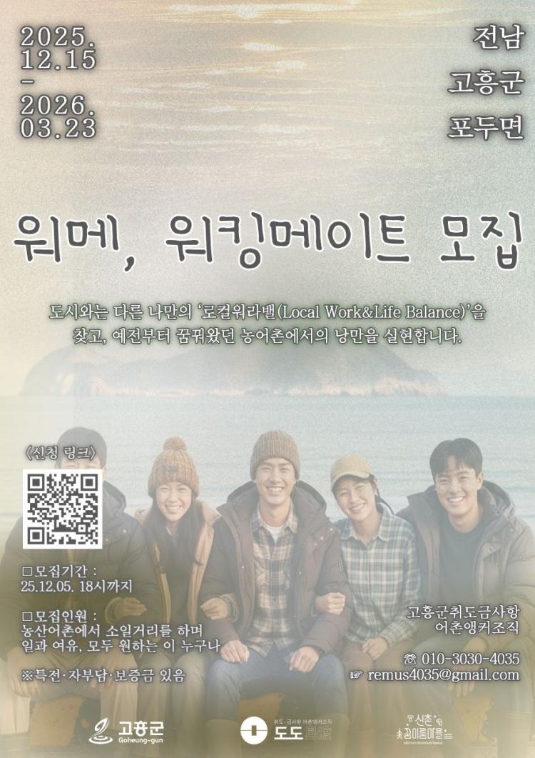 Âü¿©ÀÚ ¸ðÁýÀº 12¿ù 5ÀϱîÁö, °íÈﱺ Ãëµµ¡¤±Ý»çÇ× ¾îÃ̾ÞÄ¿Á¶Á÷ ȨÆäÀÌÁö(Áö¿ªÀÚ»êÈ Çùµ¿Á¶ÇÕ-Ä¿¹Â´ÏƼ-°øÁö)¸¦ ÅëÇØ ÀÌ·ç¾îÁö¸ç, ¸ðÁýÀοøÀº 3¸íÀÌ´Ù. ¿î¿µ ±â°£Àº 12¿ù 15ÀϺÎÅÍ 2026³â 3¿ù 23ÀϱîÁö ÃÑ 100ÀÏÀ̸ç, Áö¿ª °íÀ¯¹®È¿Í ³ó¡¤Ãࡤ¼ö»ê¾÷¿¡ ¿¸° ¸¶À½°¡ÁüÀ» °¡Áø ´©±¸³ª ½ÅûÇÒ ¼ö ÀÖ´Ù.