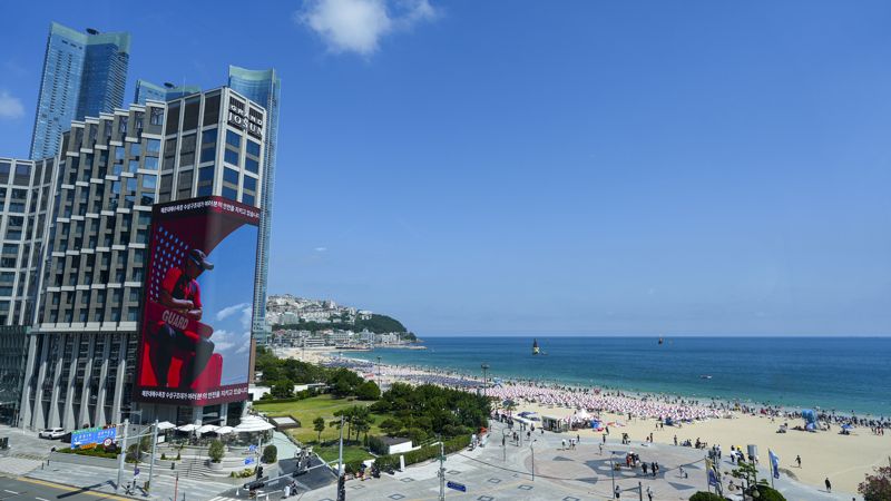 ÇØ¿î´ëÇØ¼ö¿åÀå ÀÔ±¸ ±×·£µå Á¶¼± ºÎ»ê È£ÅÚ ¿Üº®¿¡ ¼³Ä¡ÇÑ °¡·Î 25m, ¼¼·Î 31m ±Ô¸ðÀÇ °î¸é µðÁöÅÐ ±¤°íÆÇÀ¸·Î °ü±¤°´µé¿¡°Ô Å« ÁÖ¸ñÀ» ¹Þ°í ÀÖ´Ù.