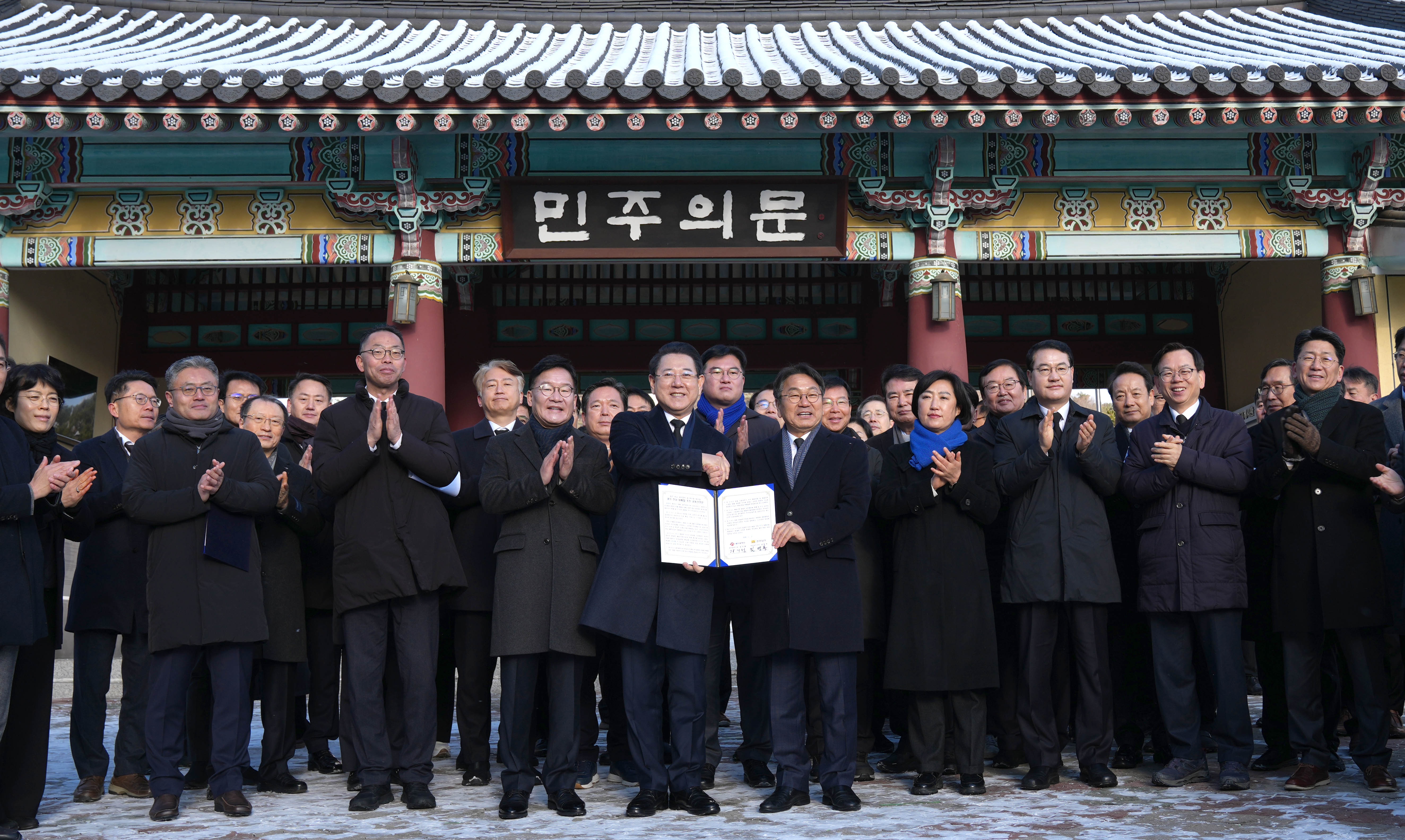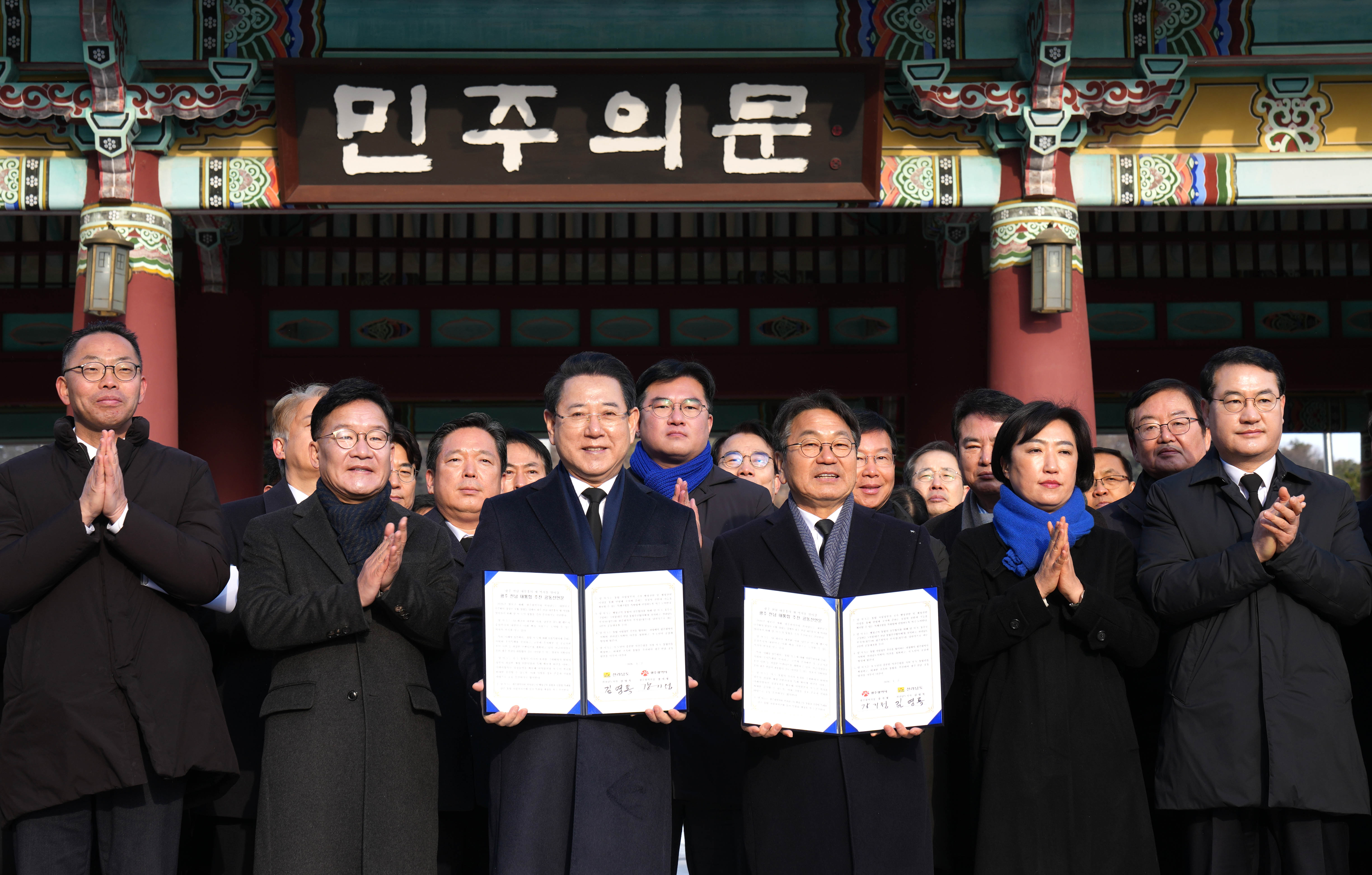 Àü¶ó³²µµ¿Í ±¤Áֽð¡ º´¿À³â »õÇØ¸¦ ¸Â¾Æ 2ÀÏ ±¹¸³5¡¤18¹ÎÁÖ¹¦Áö¿¡¼ ´ëÇѹα¹ ¹ÎÁÖÈÀÇ »ó¡ÀÎ ¿À¿ù ¿µ·Éµé ¾Õ¿¡¼ ±¤ÁÖ¡¤Àü³² ´ëºÎÈïÀÇ »õ ¿ª»ç¸¦ ¿¾î°¡±â À§ÇØ ¾ç ½Ã¡¤µµ ´ëÅëÇÕÀ» Áï°¢ ÃßÁøÇϱâ·Î ¼±¾ðÇß´Ù.