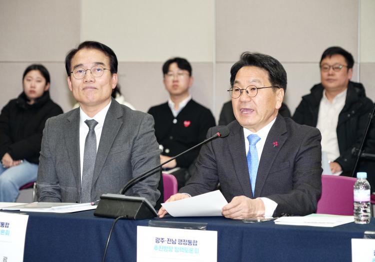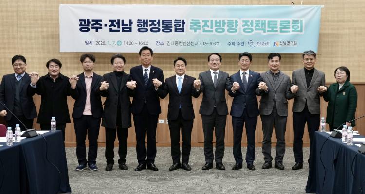 ±¤ÁÖ¿¬±¸¿ø(¿øÀå ÃÖÄ¡±¹)°ú Àü³²¿¬±¸¿ø(¿øÀå ±è¿µ¼±)Àº 7ÀÏ ¿ÀÈÄ ±è´ëÁßÄÁº¥¼Ç¼¾ÅÍ¿¡¼ ±¤ÁÖ¡¤Àü³² ÇàÁ¤ÅëÇÕ ÃßÁø Çʿ伺¿¡ ´ëÇÑ »çȸÀû °ø°¨´ë¸¦ È®º¸ÇÏ°í ¼º°øÀû ÅëÇÕ ¹æ¾ÈÀ» ¸ð»öÇϱâ À§ÇØ ¡®±¤ÁÖ¡¤Àü³² ÇàÁ¤ÅëÇÕ ÃßÁø ¹æÇâ Á¤Ã¥Åä·Ðȸ¡¯¸¦ °³ÃÖÇß´Ù.