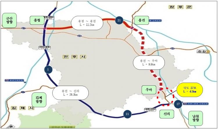 ¡Û ÇØ´ç ±¸°£Àº ÀüÁÖ¡¤¿ÏÁÖ¸¦ ÀÕ´Â ¿Ü°û¼øÈ¯µµ·ÎÀÇ ¸¶Áö¸· ¿¬°áÃàÀ¸·Î, ¿Ï°ø ½Ã ÀüÁÖ ¿Ü°û¼øÈ¯µµ·Î¸Á(ÃÑ 51.5km)ÀÌ ºñ·Î¼Ò ¿Ï¼ºµÈ´Ù. ¿Ü°û¼øÈ¯µµ·Î´Â µµ½É ±³Åë·®À» ¿Ü°ûÀ¸·Î ºÐ»êÇØ ±³Åë È¥ÀâÀ» ÇØ¼ÒÇϰí, ÀÎÁ¢ ½Ã¡¤±º °£ Á¢±Ù¼ºÀ» ³ôÀÌ´Â ÇÙ½É ±³Åë ÀÎÇÁ¶ó·Î Æò°¡¹Þ°í ÀÖ´Ù.